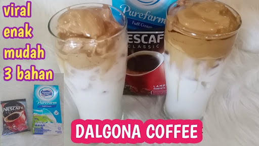 Dalgona coffee, susu yang diberi foam kopi. Tinggal masukkan susu ke dalam gelas, masukkan juga es, dan dalgona kopi di bagian atasnya. Hai semua, kali ini aku membuat resep simpel dalgona. Campurkan seluruh bahan kecuali susu full cream, aduk rata dengan cepat sampai mengental. Penampakannya yang menggiurkan membuat kebanyakan orang ingin 10.
